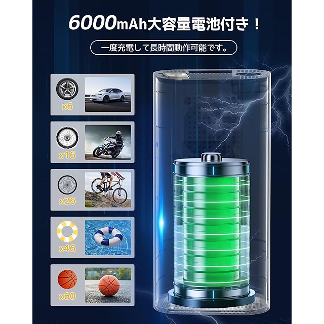 【電動空気入れ・6000mAh大容量電池付き!】 大容量6000mahリチウム電池を内蔵しており、一度充電して長時間動作可能です。フル充電で、バイクのタイヤを24回、自動車のタイヤを12回、普通のボールを60回空気を入れることができます。自動停止機能 搭載、スイッチを入れて作動せず、1分後に自動電源OFFになります。過熱保護機能も付き、10 分連続使用後、自動的に電源OFFになります。