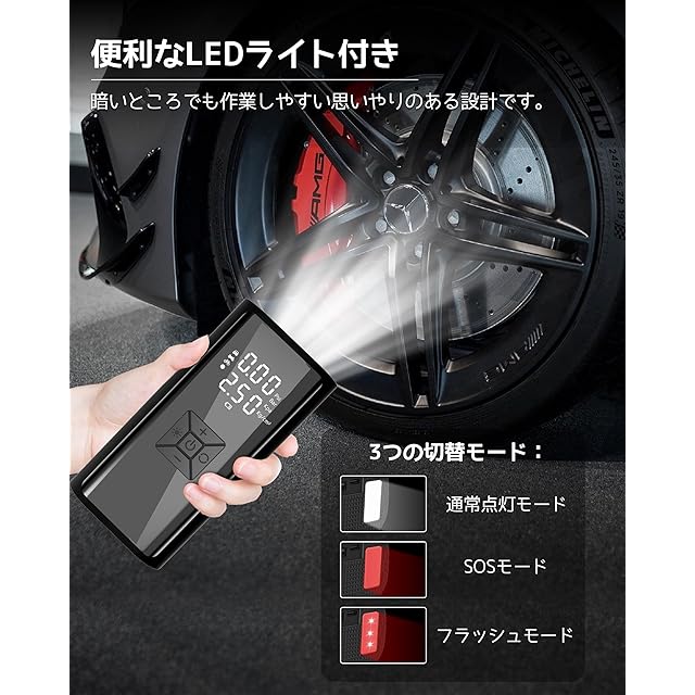 【電動空気入れ・LEDライト付き&持ち運び便利】暗いところでも作業しやすい思いやりのある設計です。3つの切替モード:通常点灯モード(応急照明)、SOSモード(注意喚起)、 フラッシュモード(非常時警告)。サイズ:15.8*5.6*7.9cm。小型軽量デザインなので、女性でも手軽に使えます。収納袋は付属して、収納がしやすくなります。