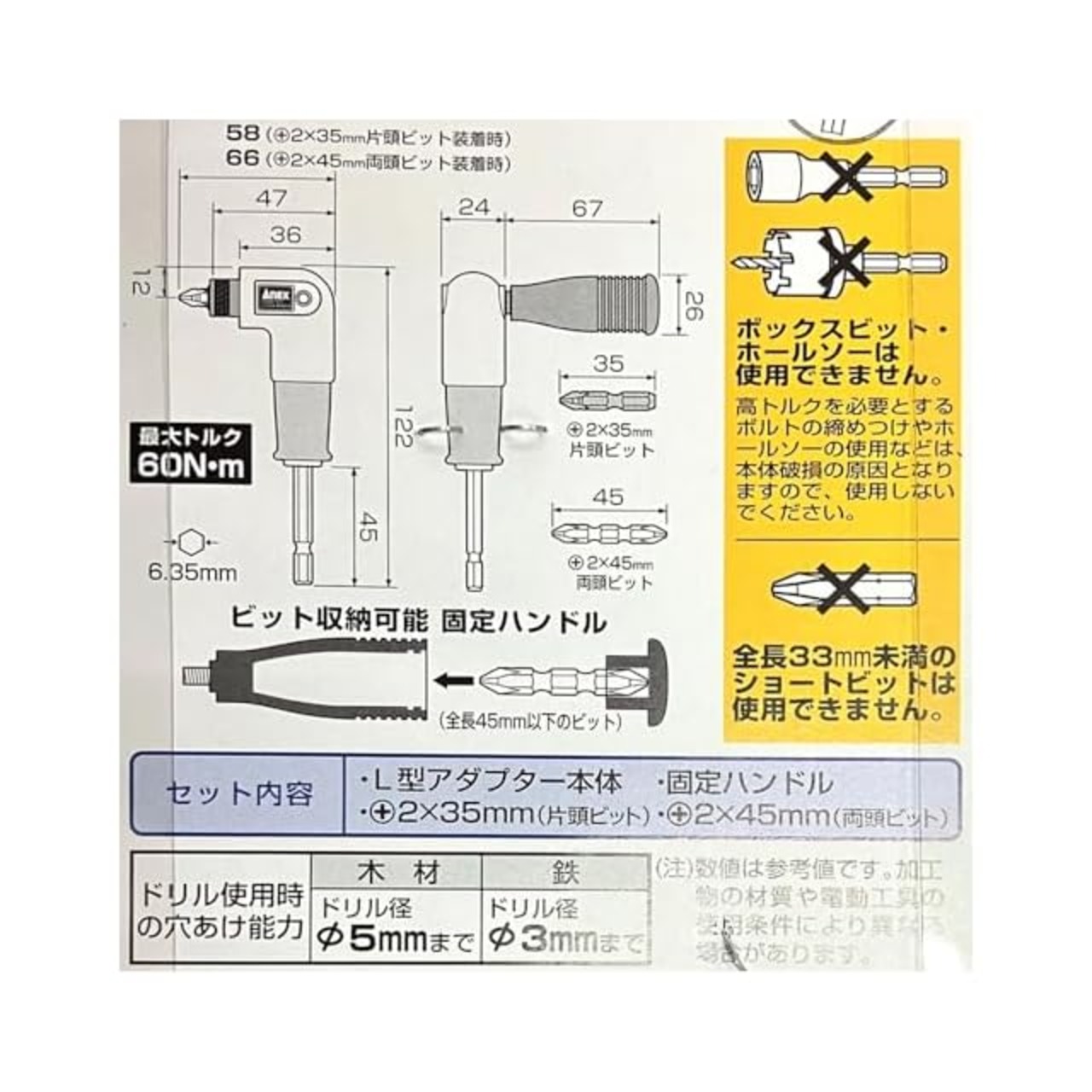 セット内容:L型アダプター本体、固定ハンドル、+2×35mm専用ビット、+2×45mm両頭ビット