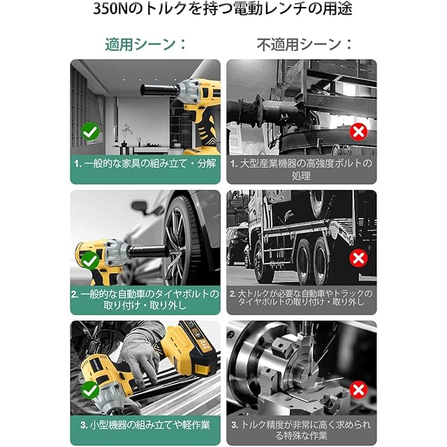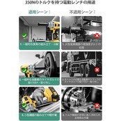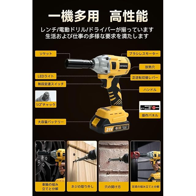 【多機能アクセサリーと使い勝手】さまざまなアクセサリーが付属したこのインパクトレンチは、自動車のメンテナンスやタイヤ交換など、多岐にわたる作業に対応します。ドリルビットドライバーやインパクトスクリュードライバーとしても使用可能で、作業の幅を広げます。家庭用DIYからプロのメンテナンスまで、幅広いニーズに対応します。
