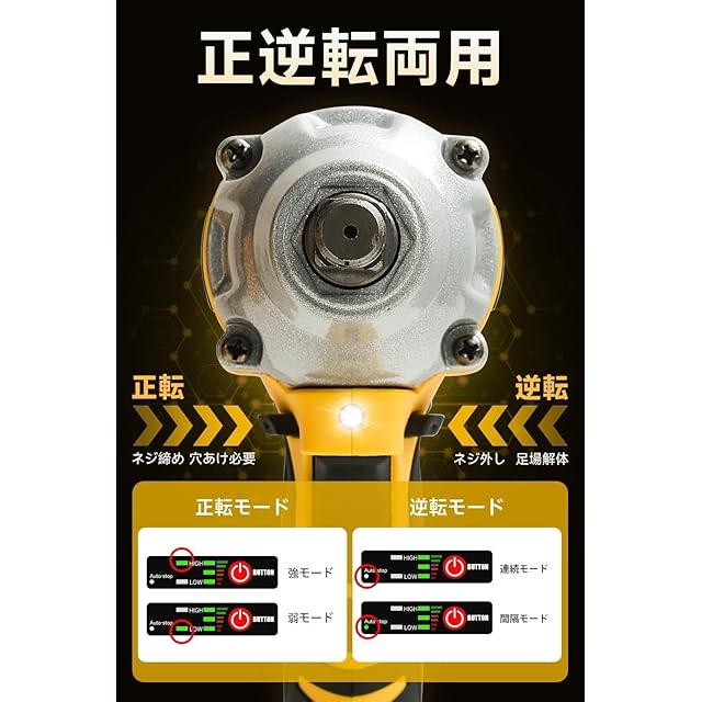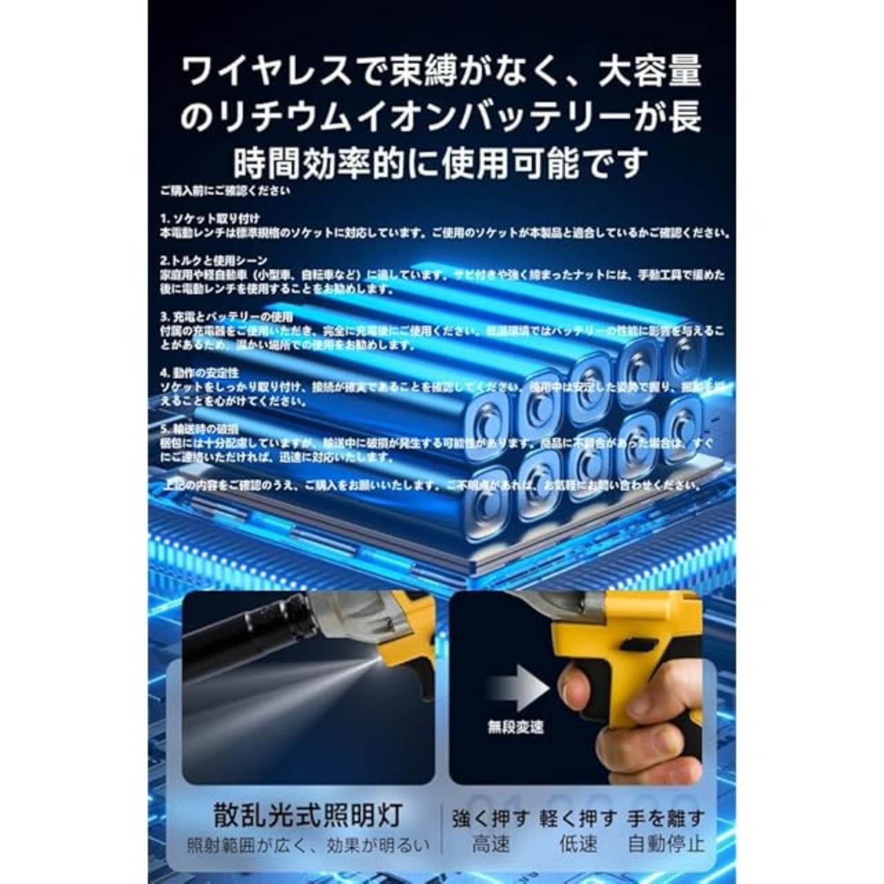 【バッテリーの持続性とLED照明】大容量のリチウムバッテリーを搭載したこのインパクトレンチは、長時間の作業に対応します。2つのインパクトレンチが付属しており、頻繁な充電の中断をなくし、作業の効率を確保します。内蔵のLED照明が、昼夜を問わず作業領域を照らし、作業の正確性と安全性を高めます。