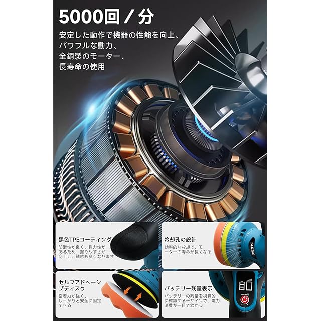 商品名:ポリッシャー 充電式 ダブルアクション ポリッシャー 大容量バッテリ一2個搭載 車 コードレスポリッシャー 充電式ポリッシャー 電動ポリッシャー ブルー