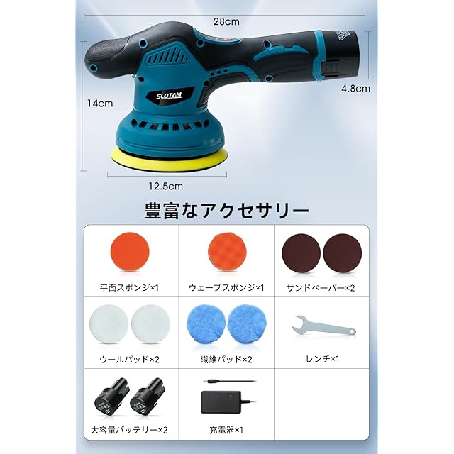 【用途が広い、充実したアクセサリー】: 平面スポンジ *1、ウェーブスポンジ *1、サンドペーパー *2、ウールパッド *2、繊維パッド *2、ウールパッド *1、大容量バッテリー *2、充電器 *1、ポリッシャー本体 *1、レンチ *1。ポリッシャーの豊富なアクセサリーは、さまざまな場面や異なる素材の表面のケア、磨き、研磨を可能にし、ポリッシャーの用途をより幅広くし、追加のアクセサリー購入の必要がなく、1台のポリッシャーで多様なニーズを満たすことができます。自動車のワックスや磨きだけでなく、家具の研磨、大理石の磨き、金属製品の錆落としにも対応し、さらに幅広い用途が可能です。