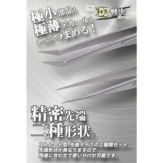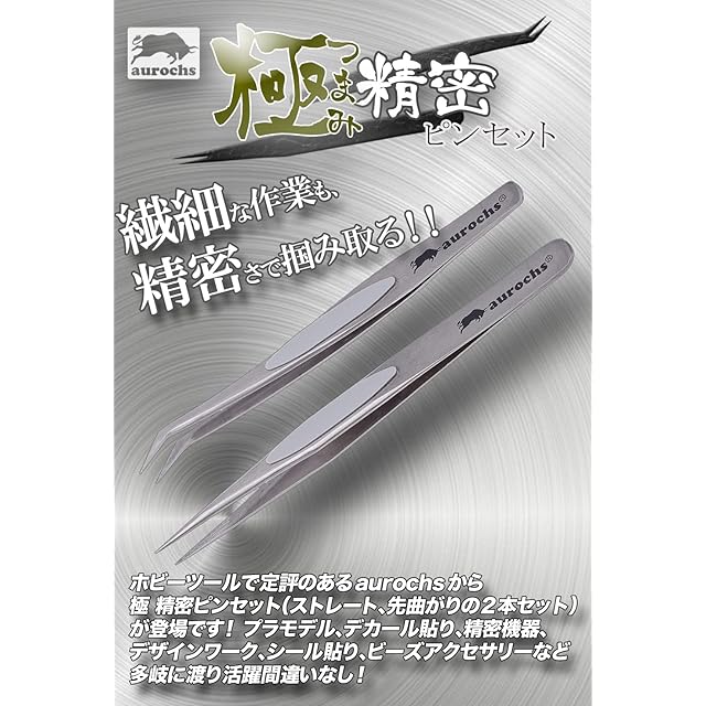 ホビーツールで定評のあるaurochsから 極 精密ピンセット(ストレート、先曲がりの2本セット)が登場です! プラモデル、デカール貼り、精密機器、デザインワーク、シール貼り、ビーズアクセサリーなど多岐に渡り活躍間違いなし! 本体はステンレス製、持ち手のシリコン製の滑り止めでホールド性アップ、バネ強度も適度に調整されており長時間の作業でも疲れにくくなっております。 ストレート型、先曲タイプの2種類セット。 先端形状が異なりますので用途に合わせて使い分けが可能です。 専用の金属製ケース付属で持ち運び時の紛失や怪我を防ぎます。本体先端にも保護キャップが付いておりダブルで安心の設計になっております。