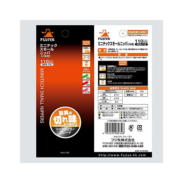 商品名:フジ矢 スモールニッパ 110mm 刃部鏡面仕上げ より線Ф2.0まで切断可能 MP4-110