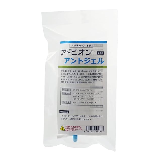 アドビオンアントジェルはアリ用の毒餌剤です。糖分を中心とした餌の配合で、アリをしっかり誘引、食べさせます。働きアリがアントジェルを持ち帰り、巣を駆除します。本品は半透明、無臭のジェル剤です。施工後も目立たず、屋内に出てくるアリ駆除にも使いやすくなっています。 また、シリンジタイプ(注射器を打つような形)なので、狭い隙間にも処理しやすくなっています。 【適用法令】該当なし