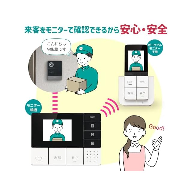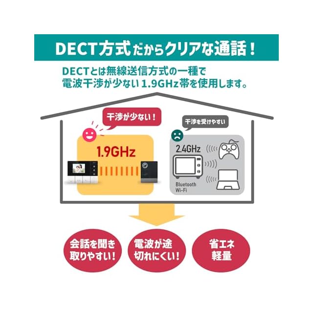 ■取付条件:露出壁掛け(金具付属) ■無線通信方式:1.9GHz DECT準拠方式 ■使用可能距離:見通し約100m