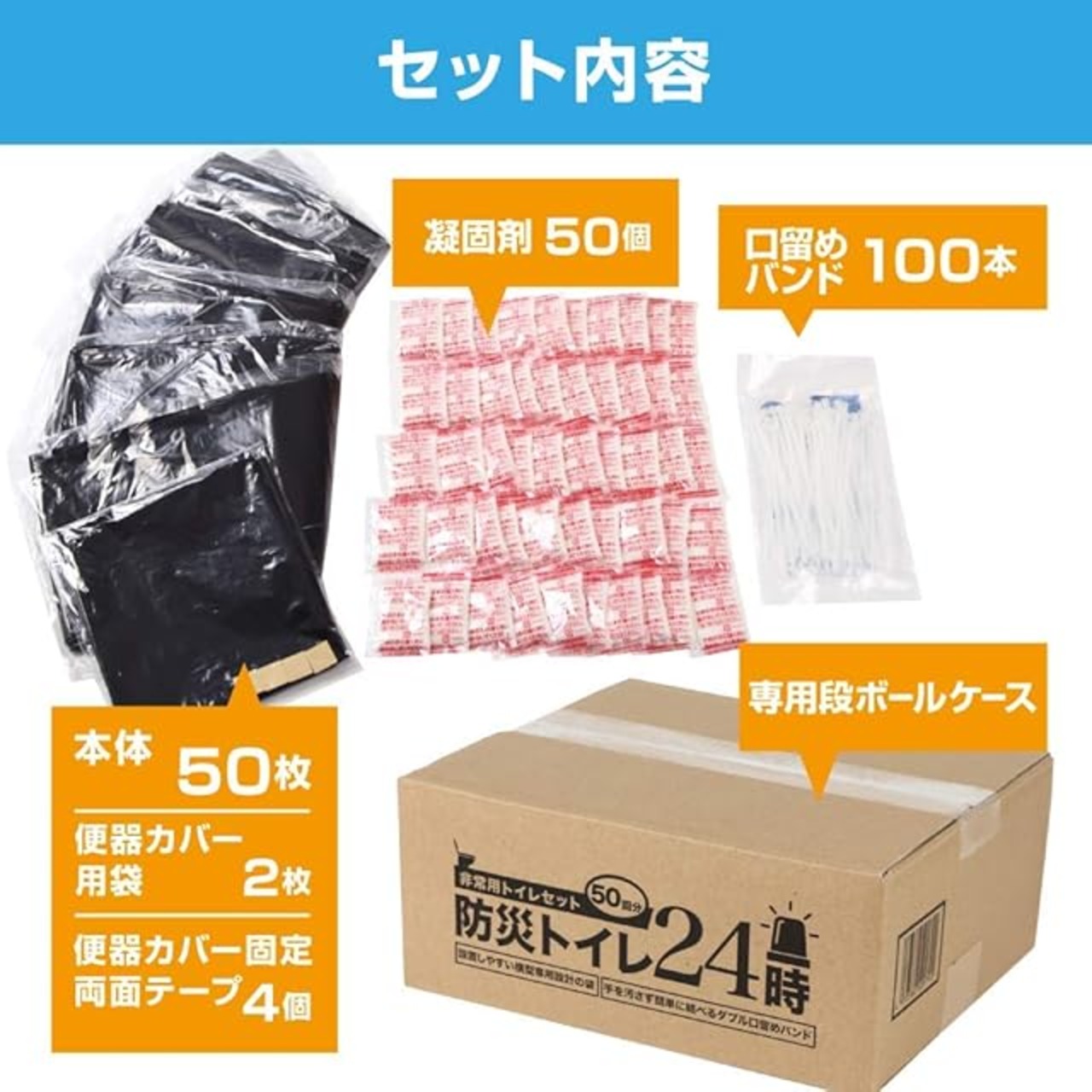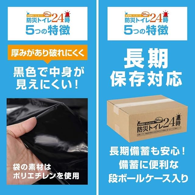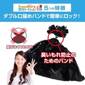 商品名:防災トイレ24時 50回分 非常用 簡易トイレ 日本製【手を汚さない口留めバンド付き】(防災 緊急 災害 トイレ)