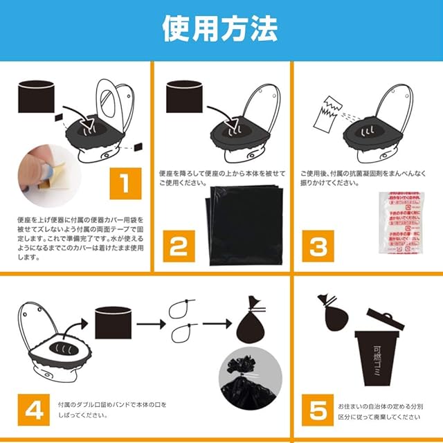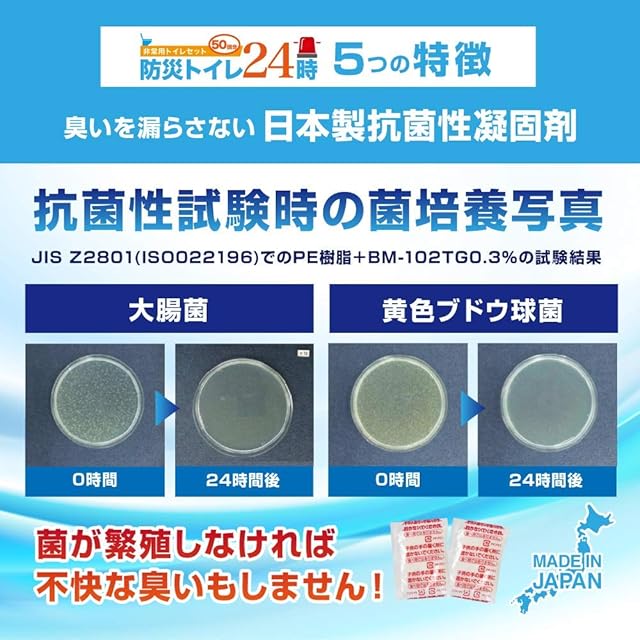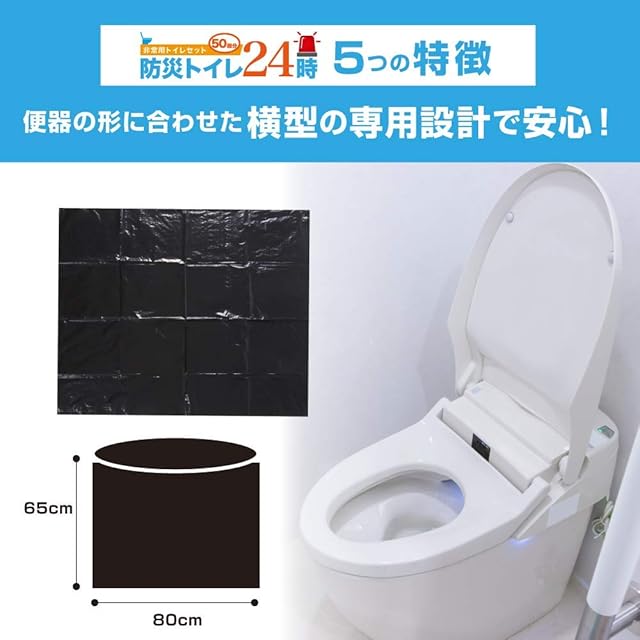 防災トイレ24時(50回分) 大きめの洋式トイレにも直ぐに 設置可能な専用設計で安心 ダブル口留めバンドで 保管時のモレも安心 臭いをもらさない 日本製抗菌性凝固剤で安心 10年保存対応で長期備蓄も安心 【商品の特長】 ・水が使えない非常時に洋式トイレに被せて使用する緊急トイレです。 ・大きめの便器にも合うよう設計されていますので、手間取らず簡単に設置できます。 ・抗菌剤入り凝固剤で直ぐに固まり、ダブル口留めバンドがモレや臭いを防ぎます。 【ご使用方法】 ①便座を上げ便器に付属の便器カバー用袋を被せてズレないよう付属の両面テープで固定します。 これで準備完了です。水が使えるようになるまでこのカバーは着けたまま使用します。 ②便座を降ろして便座の上から本体を被せてご使用下さい。 ③ご使用後、付属の抗菌凝固剤をまんべんなく振りかけて下さい。 ④付属のダブル口留めバンドで本体の口を縛って下さい。 ⑤お住まいの自治体の定める分別区分に従って廃棄して下さい。 【使用上の注意】 ・本品は1回の使い切りとなります。 ・尿がない場合は凝固剤は固まりません。 ・凝固剤を便器に直接入れないで下さい。 ・凝固剤は食べ物ではありません。誤って食べたり飲んだりしないで下さい。 ・凝固剤が皮膚や衣服に付着した場合は速やかに水で洗い流して下さい。 ・万一凝固剤を飲み込んだ場合は直ぐに吐かせ、また、皮膚に付着して肌に異常があれば、 医師の診断を受けて下さい。 ・直射日光や高温多湿の場所を避け保管し、乳幼児の手の届く所に放置しないで下さい。 ・小さなお子様が使用される場合は必ず保護者が立会い、安全を確認して下さい。 ・本体の用途以外には使用しないで下さい。 ・お住まいの自治体の定める分別区分に従って廃棄して下さい。 【品質表示】 品名:防災トイレ24時 TPT02 本体50枚、凝固剤50個、口留めバンド100本、 便器カバー用袋2枚、カバー固定両面テープ4個 サイズ:約800×650mm(本体) 材質:ポリエチレン(本体)、高吸水性樹脂、無機系抗菌剤(凝固剤) 66ナイロン(口留めバンド) MADE IN JAPAN