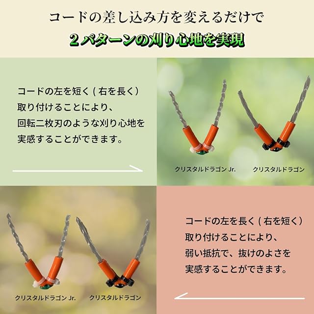 ●ブラシ刃自体の長さが左右異なるため、取り付け方法によって抜けの良さの実感(左を長く)、回転2枚刃を実感(左を短く)、のようなカスタムが可能。また、クリスタルドラゴンには、ブラシ刃を覆うオレンジ色のパイプにあえて上下切込みを入れることで、ブラシ刃の柔軟性を最大限に追及 刈っていくたびに、ブラシ刃が先端から減耗し、それによってより鋭利になり、刈れば刈るほど切れ味が増大