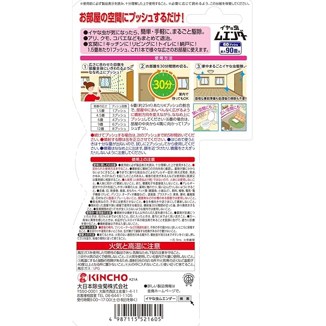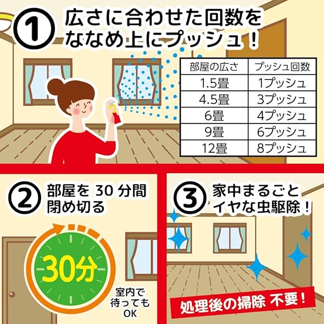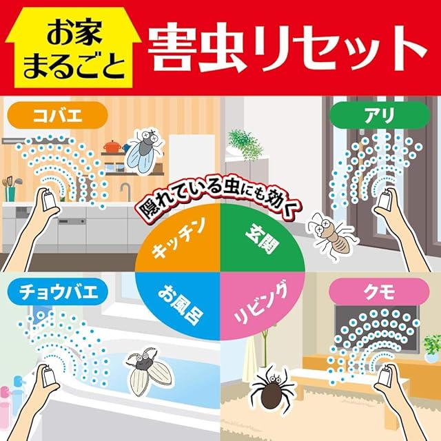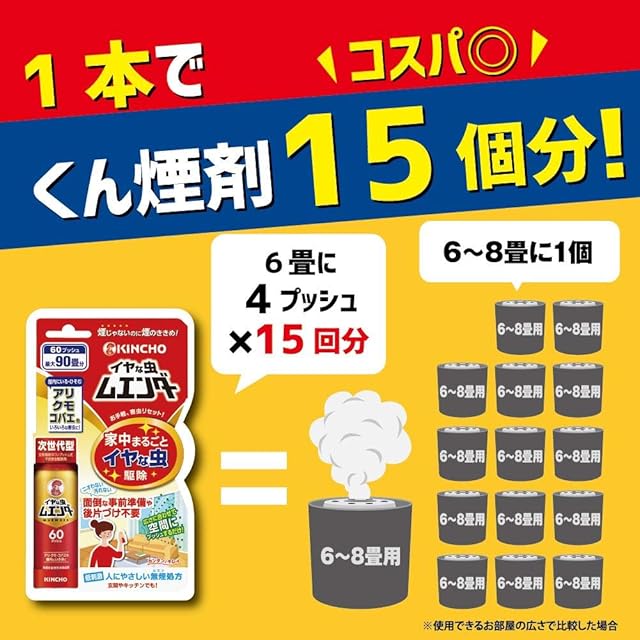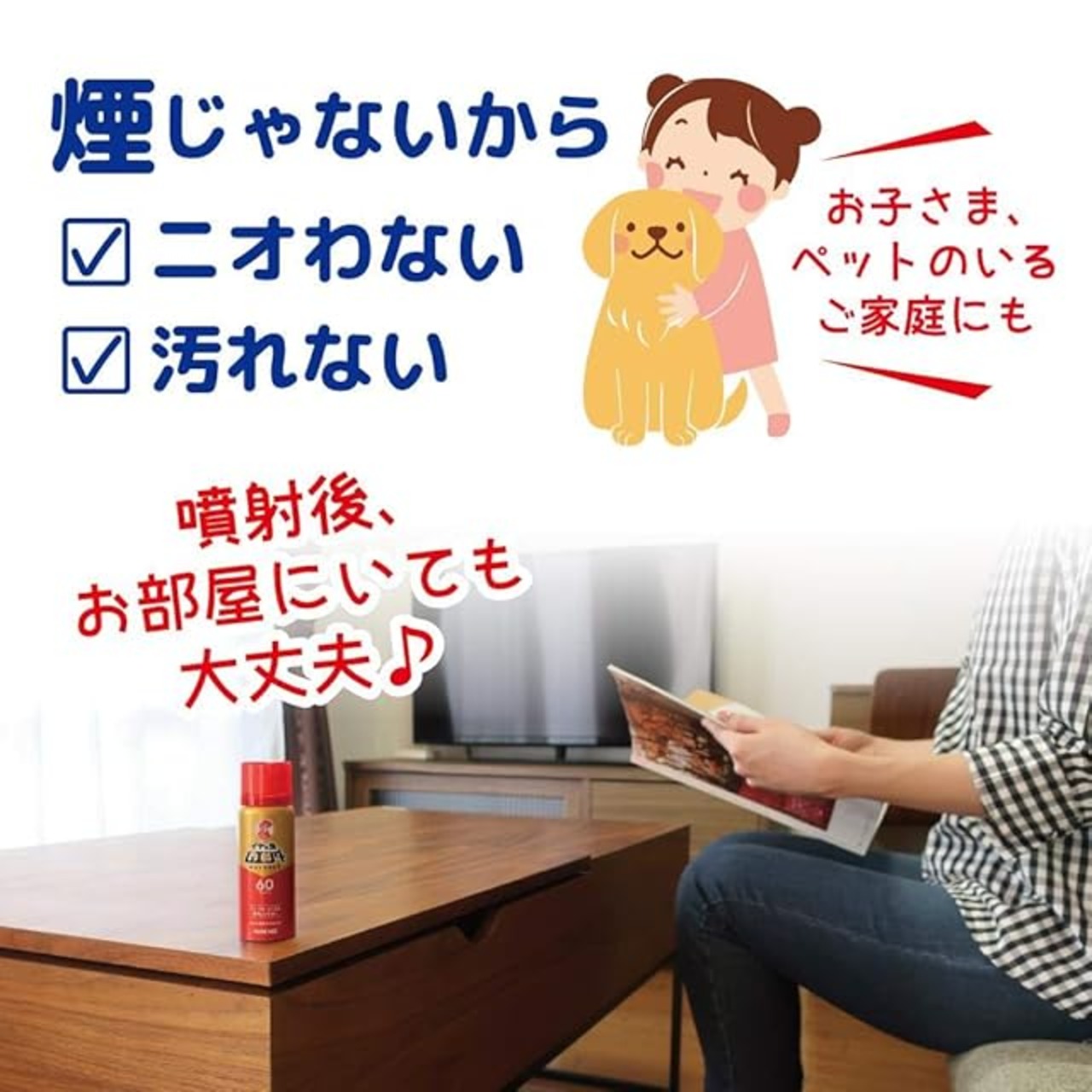 【特徴】空間噴射のワンプッシュ式不快害虫駆除剤。面倒な事前準備は不要。60プッシュ。