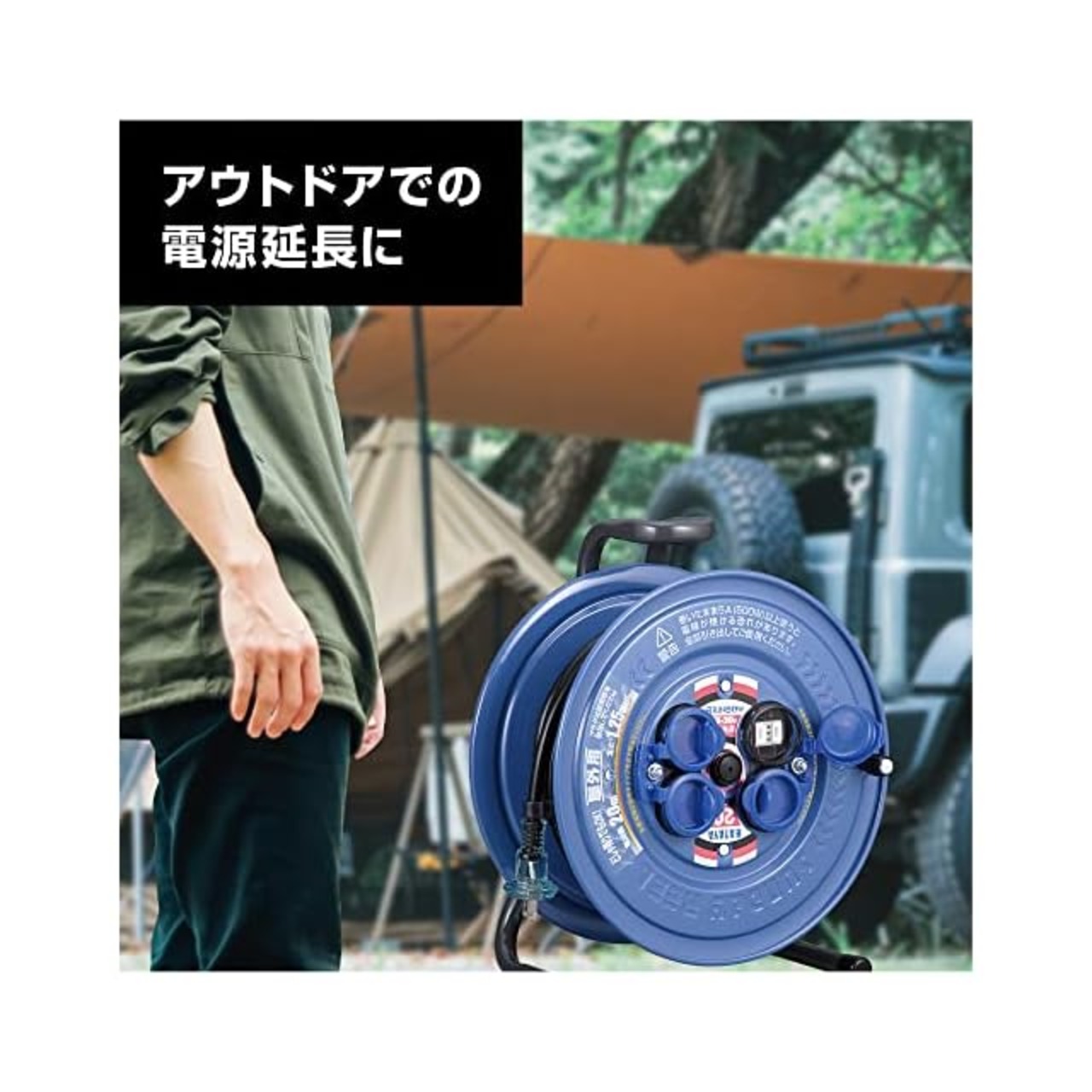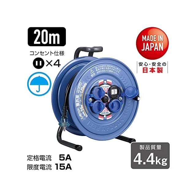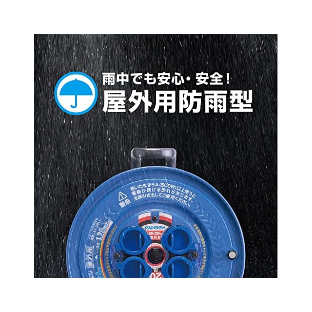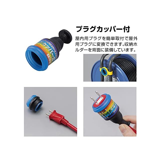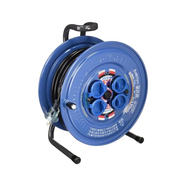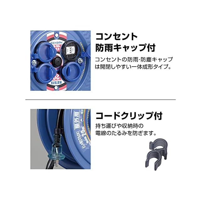 【特徴】サンデーリールベースの屋外用コードリールです。便利に使える防雨型のコードリールでコンセントの防雨・防塵キャップは一体成型タイプを採用しており、開閉が簡単です。Wコンセントを一体モールド成型し内部配線部への水の侵入を防ぐ、防雨型四ッ口コンセントです。ハタヤオリジナルの折り曲げフレームは、持ち運びやすいグリップを上部に、仰向けに置いた時に安定する凸部を背面部に一体に形成しています。屋内用プラグを簡単取付で屋外用プラグに変換可能なプラグカッパーを1個付属しており、収納ホルダーを背面に装備しています。