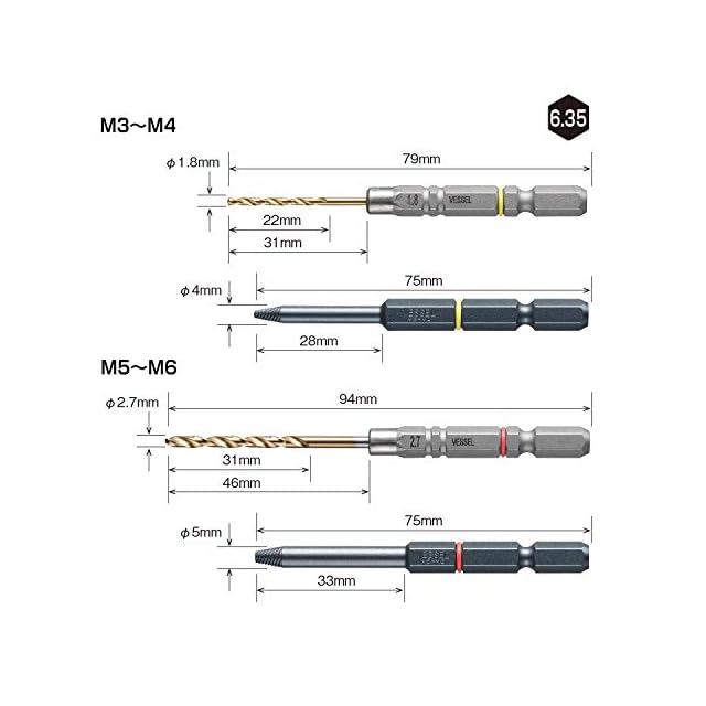 ●M3~M4用 ドリルビット: 1.8mm、ネジビット:Φ4、●M5~M6用 ドリルビット: 2.7mm、ネジビット:Φ5