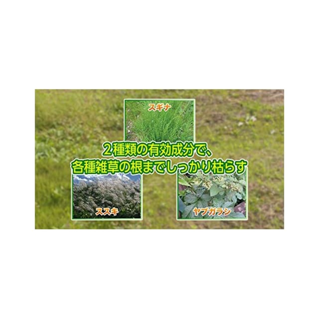 特徴:2種類の有効成分で、スギナ・ススキ・ヤブガラシなど各種雑草の葉や茎だけでなく根までスッキリ枯らします。