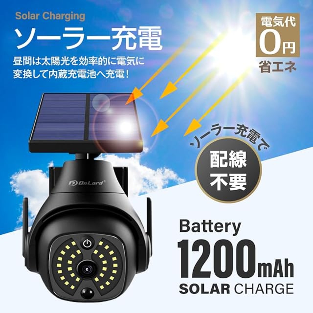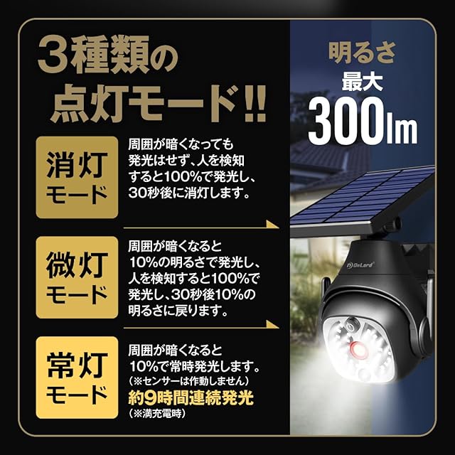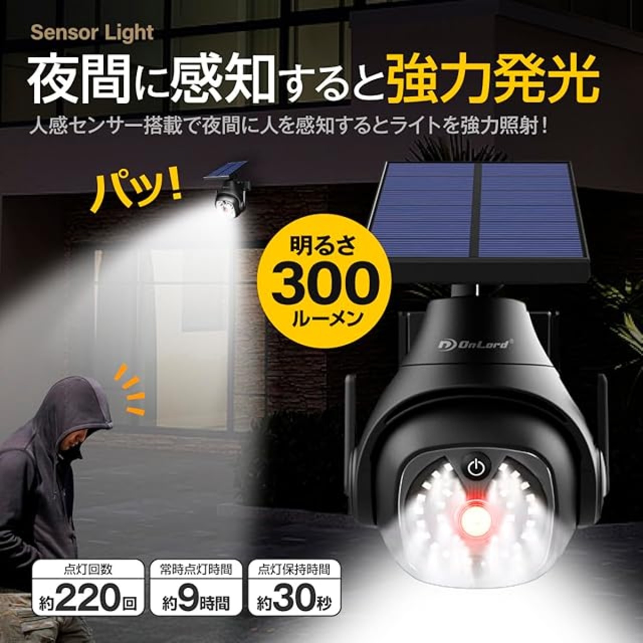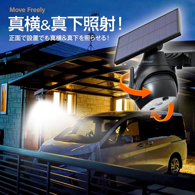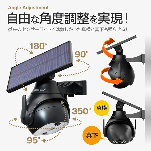 商品名:オンロード(OnLord) ソーラー充電式 PTZ型防犯センサーライト 光秀 LEDライト 人感センサー 自動発光 配線不要 屋外 OL-340B