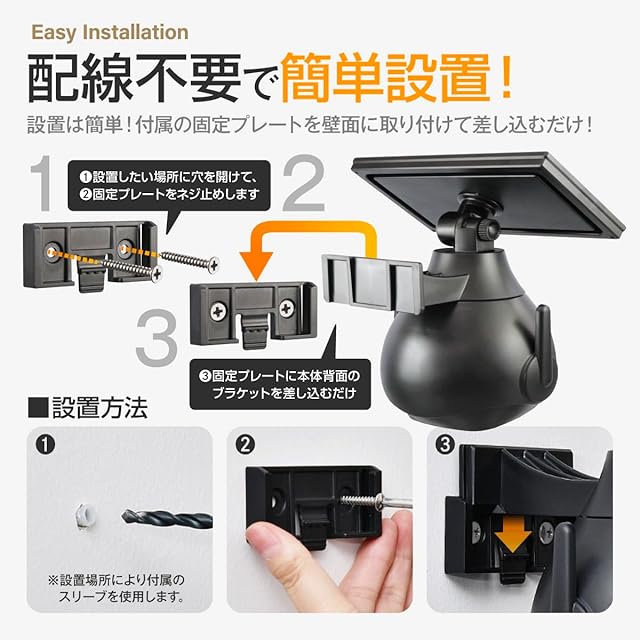 ※非共通【カラー】ブラック<br> 【電源】リチウムイオン充電池 3.7V 1200mAh(※内蔵充電池の交換はできません)<br> 【光源】LED 20灯(全光束約300ルーメン)<br> 【色温度】6500K<br> 【点灯回数】約220回(満充電時の理論値)<br> 【常時点灯時間】約9時間(満充電時の理論値)<br> 【防水・防塵性能】IP65(※完全防水ではありません)<br> 【製品サイズ】約145×120×170mm(幅×奥行×高さ)<br> 【重量】約318g<br> 【使用推奨温度範囲】-20~50℃<br> 【生産国】中国<br> 【期間】製品到着後1年間<br> <br> 【セット内容】<br> 1.製品本体<br> 2.取付用ネジ×2<br> 3.コンクリート用スリーブ×2<br> 4.固定プレート(本体セット済)<br> 5.日本語取扱説明書<br> 6.製品書<br> ※取扱説明書と書はPDFダウンロード版になります。<br> <br> 【JANコード】4573180349000<br>