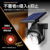 ★PTZ型防犯カメラの形をした圧倒的な存在感のセンサーライトで不審者の侵入を抑止!★ ★夜間は赤色LEDが常時点滅して不審者を威嚇!防犯から非常時の誘導灯にも★ ★昼間はソーラーパネルで太陽光を効率的に充電!夜間は人感センサーで自動発光!★ ★自由な角度調整を実現!従来のセンサーライトでは難しかった真横と真下も照らせる!★ ■PTZとは遠隔追尾型防犯カメラの機能である下記の頭文字をとった略語です。 ・Pan(パン):水平方向への首振り ・Tilt(チルト):垂直方方向への首振り ・Zoom(ズーム):拡大(望遠)と縮小(広角) ※本製品に上記の機能はありません。
