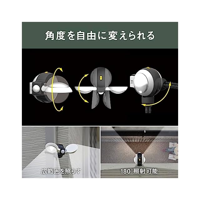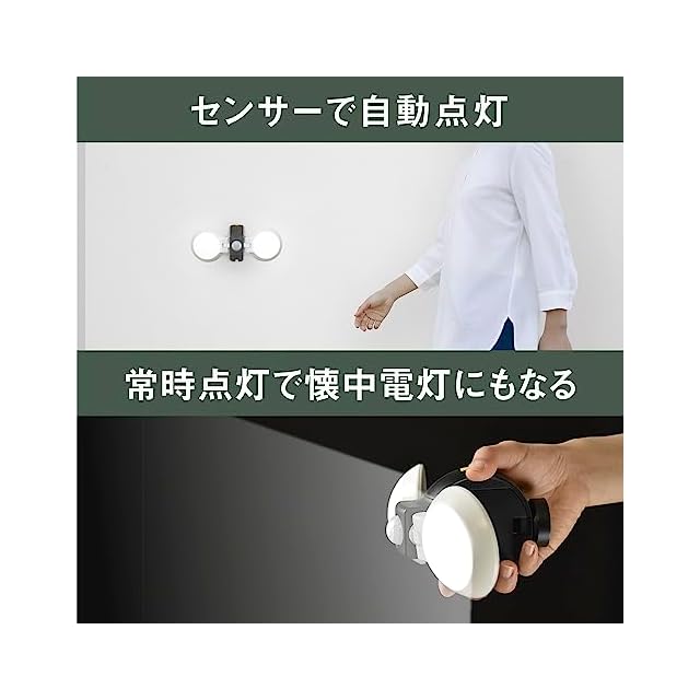 探知方式:焦電型赤外線人感センサー 、 探知範囲:最大約100度・最遠4m(取付高さ2m時) 、 モード切替:センサー(約10秒点灯) / 切 / 常時点灯