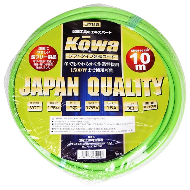 商品名:宏和工業 kowa ソフトタイプ 延長コード 15A・10m 3ツ口 ミドリ KM04-10 日本製