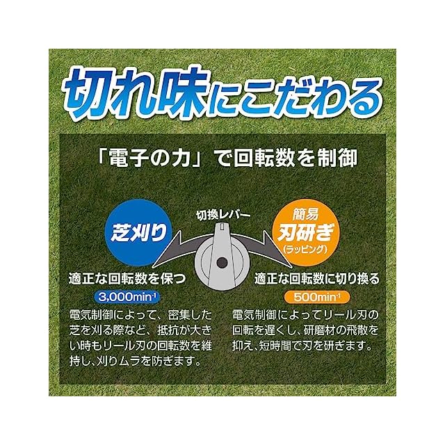 無負荷回転数:芝刈り時=毎分3,000回、歯止研ぎ時=毎分500回