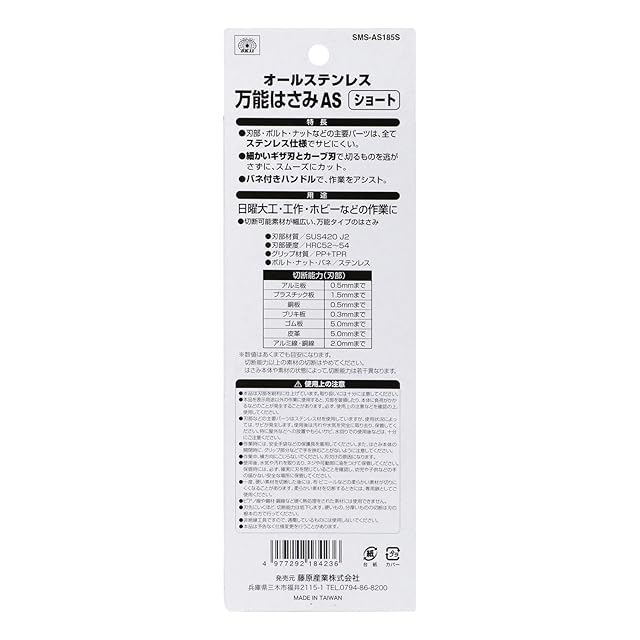 商品名:SK11(エスケー11) 万能はさみ オールステンレス ショート 全長約185mm SMS-AS185S 作業用・大工用・アウトドア用