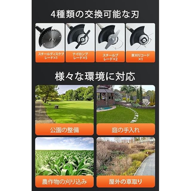 【多機能ブレードで幅広く対応する草刈り機】ナイロン刃・鉄板刃・草刈り刃・鋼刃の4種を搭載した草刈り機で、公園・庭・農地など様々な場所に対応。スピード調整機能付きで、強力刈り込みも精密作業もこの草刈り機1台でOK。