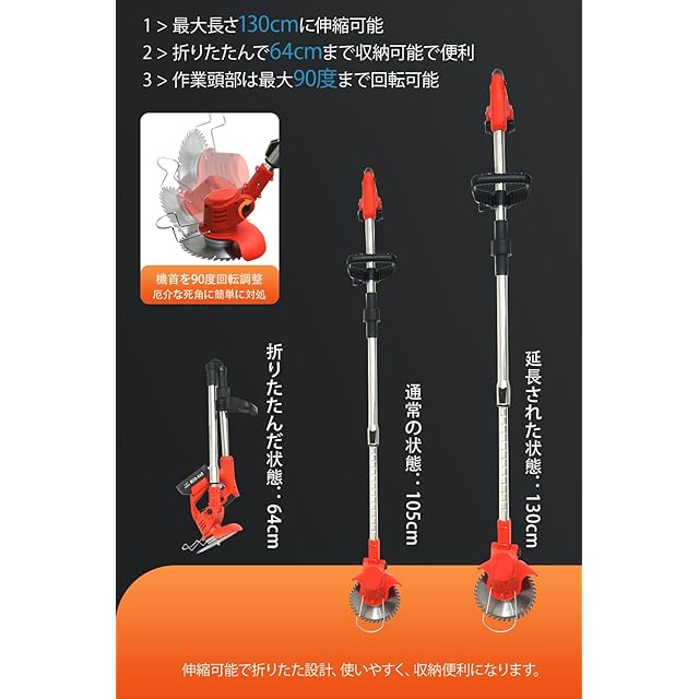 【伸縮自在、誰でも使いやすい草刈り機】最大130cmまで伸びるステンレス製ポールで、身長や用途に合わせて調整可能。収納時は64cmと超コンパクト。軽量で女性や高齢者も扱いやすい草刈り機です。持ち運びもラクラクで、収納場所を選びません。
