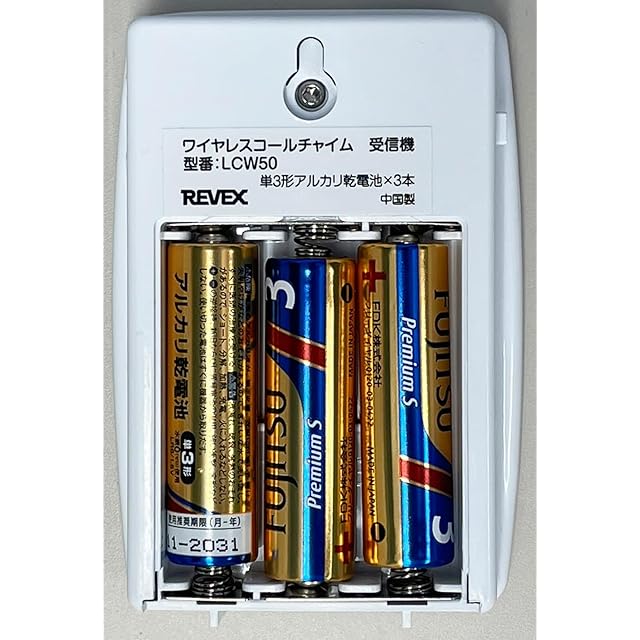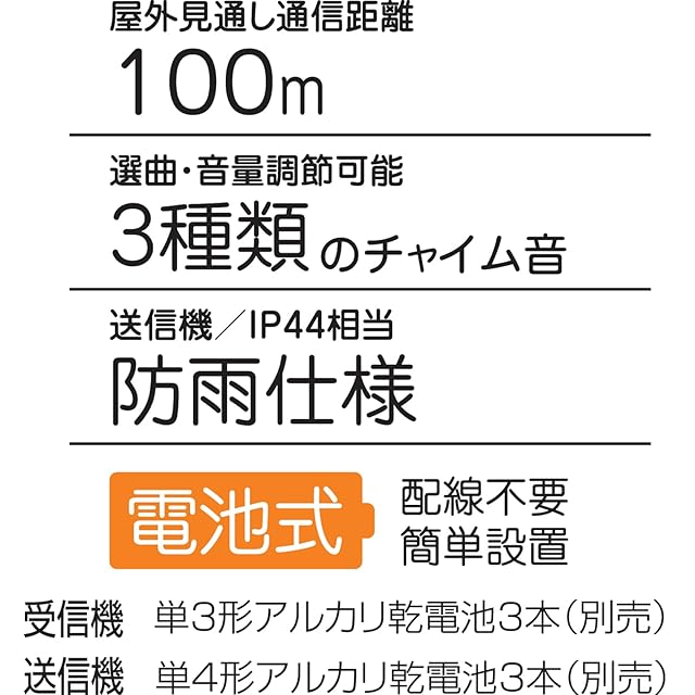 受信チャイム:66×96×33mm (70g ※電池含まない)、使用温度範囲/-10度〜+40度、電源/DC4.5V単3アルカリ電池3本 (別途ご用意ください)、電池寿命/約6カ月 (1日10回受信、気温20度時)、電源スイッチ/あり、音量調節/5段階、最大約83dB/1m、着信表示LED/チャイム鳴動中に赤LEDが点滅、受信可能距離/屋外見通し最大100m/屋内見通し最大50m、使用エリア/屋内用