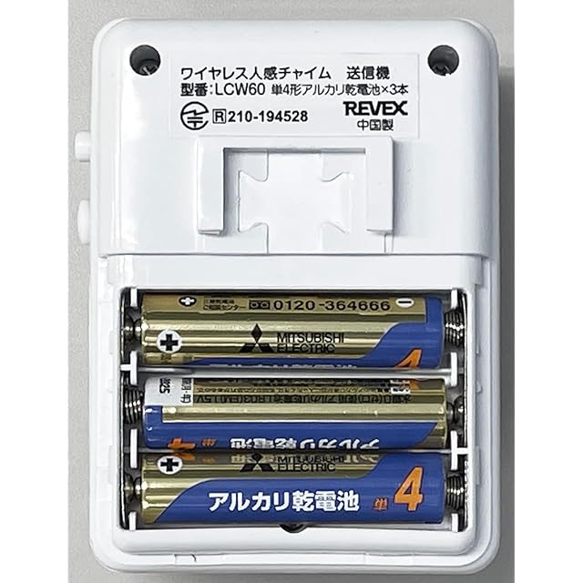 人感センサー送信機:サイズ(約)/高さ80×幅59×奥行50mm (63g ※電池含まない)使用温度範囲/-10度〜+40度、電源/単4形アルカリ電池×3個(別売)、電池寿命/約1年半(10回/1日動作送信、20度時)、IDコード数/6万通り(変更不可)、音の種類/3種類、使用エリア/屋内または屋外軒下 (防沫型・IP44)