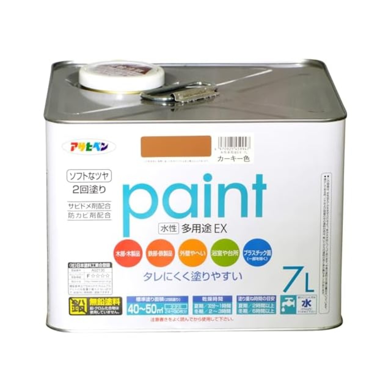 アサヒペン 塗料 ペンキ 水性多用途EX 7L カーキー色 水性 多用途 半ツヤ ソフトなツヤ 低臭 防カビ サビドメ剤配合 タレにくく塗りやすい シックハウス対策品 日本製 | emishop315