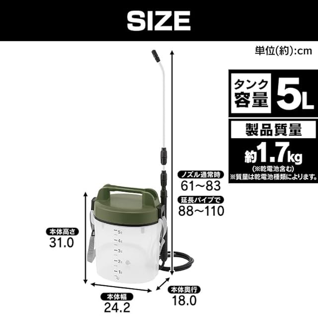 アイリスオーヤマ(IRIS OHYAMA) 噴霧器 電動 乾電池式 カーキ 家庭用 【透明タンクで残量が見える】 タンク容量 5L 延長パイプ付き 最大110cm 霧の細かさが調整可能 IR-N5 | emishop315
