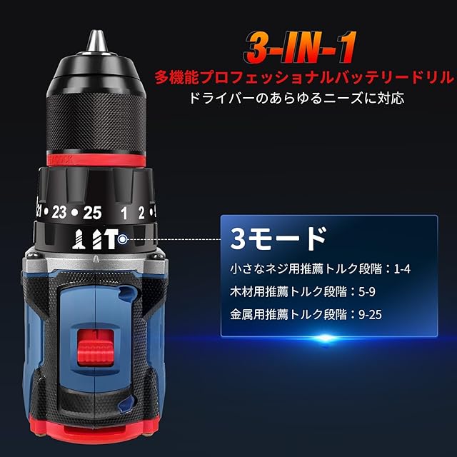 【二段変速&無段変速】高/低2速、25段トルク搭載のドリルドライバーです。作業に合わせて自由にトルクを調整します。電動ドリルの回転スピードは2段階(0~400RPM/0~1400RPM)が切り替え、トリガーを握る力の強弱で無段階微調整が可能です。