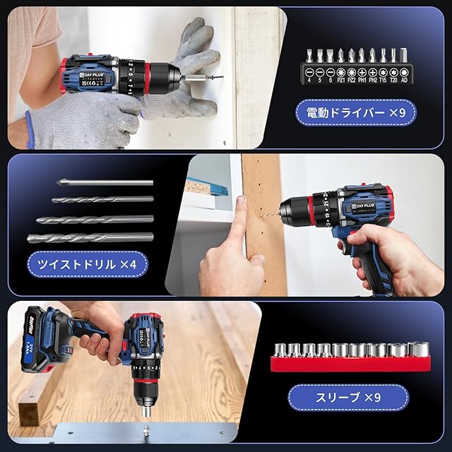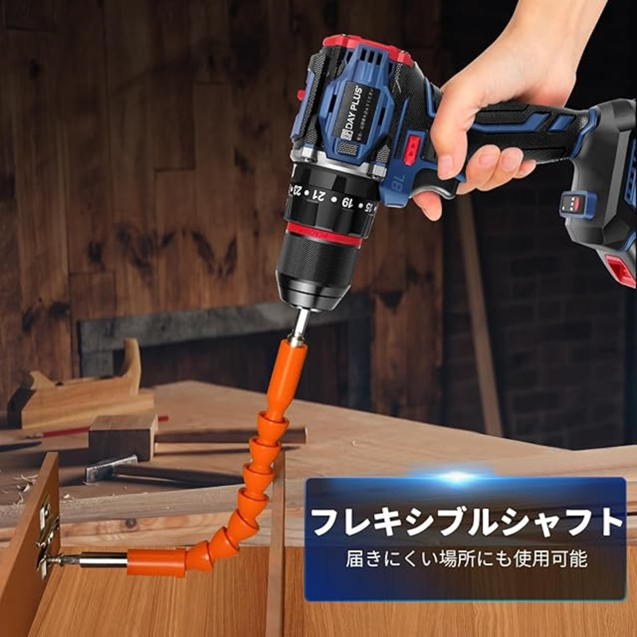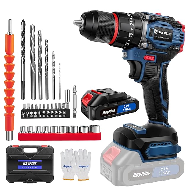 商品名:DayPlus 電動ドリルドライバー ブラシレスモーター搭載 21V/マキタ対応18Vバッテリー互換 最大45N・m 25+3段階トルク調節 スピード調節/正逆転切替 初心者向け DIY工具セット 29点アクセサリー付属(ドリルビット/ドライバー付き)