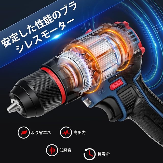 【ブラシレスモーター電動ドライバーセット】1台3役・25+3段階トルク調整; ドリルとドライバーとして使用でき、電気レンチの役割もできます。イパワーブラシレスモータ搭載,最大トルク45N・m。高出力・高耐久・メンテナンスフリー。コードレス設計なので、電源がない場所でも手軽く使えます,1.5Ah*M社対応電池搭載し。