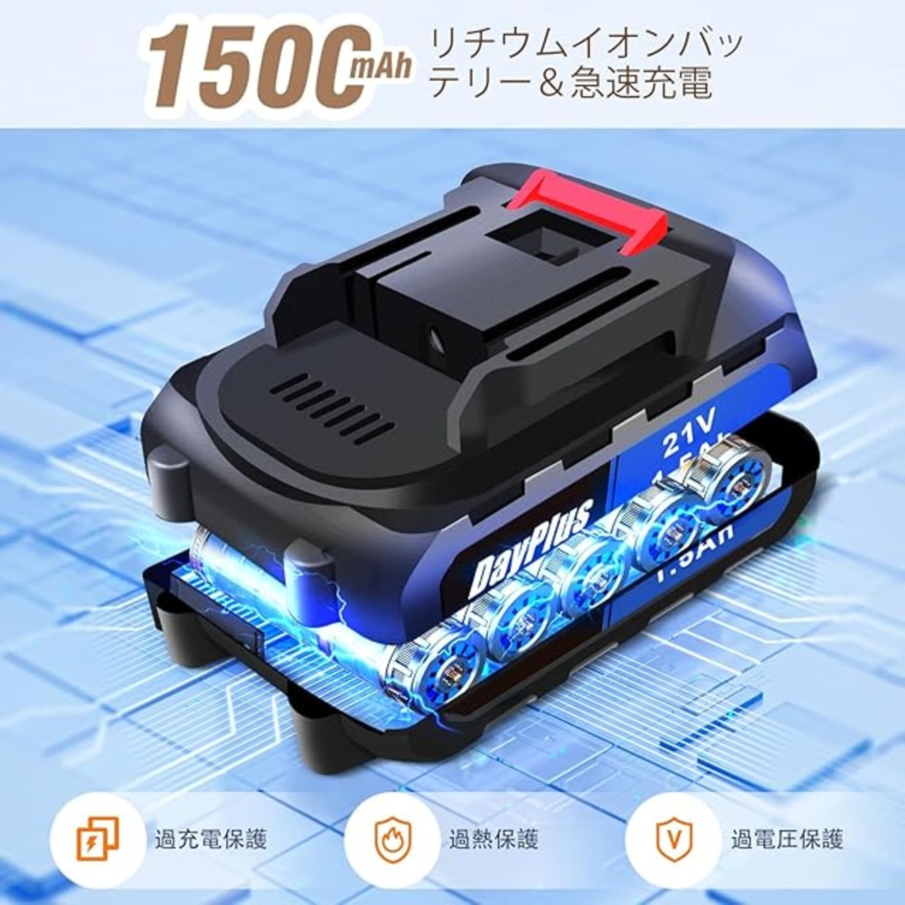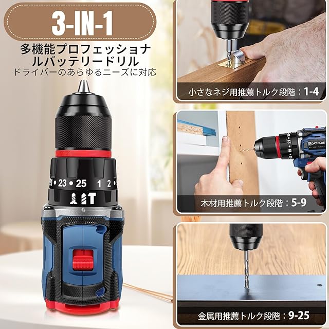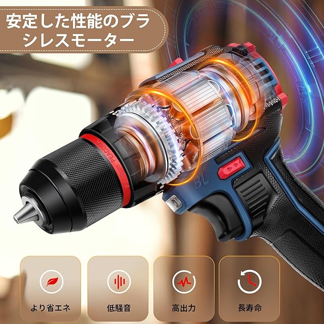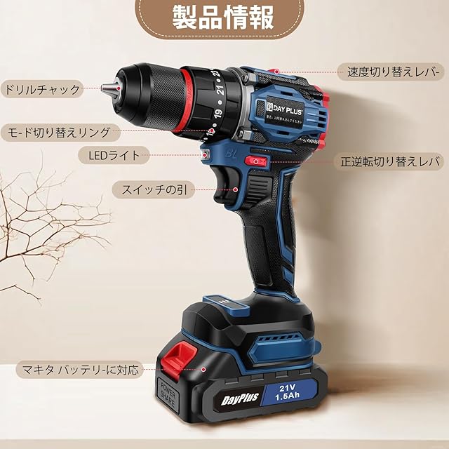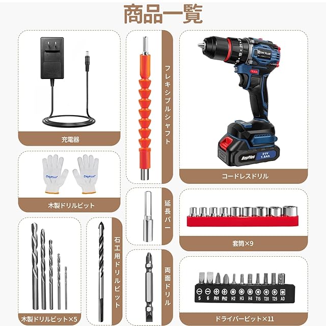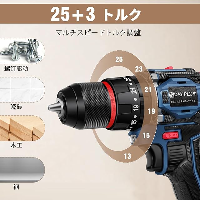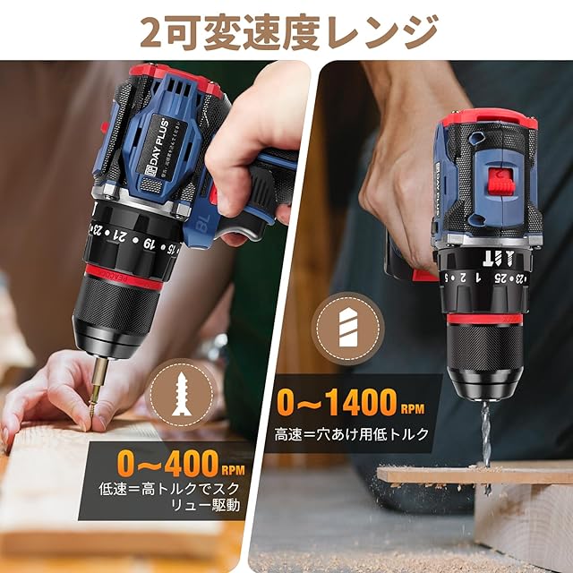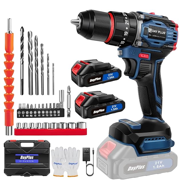 商品名:DayPlus 電動ドリルドライバー ブラシレスモーター搭載 21V/マキタ対応18Vバッテリー互換 バッテリー2個搭載 最大45N・m 25+3段階トルク調節 スピード調節/正逆転切替 初心者向け DIY工具セット 29点アクセサリー付属(ドリルビット/ドライバー付き)