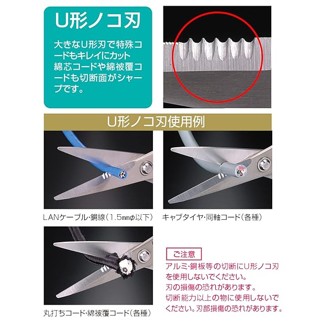[切断能力]ビニルキャブタイヤ(2mm²×4)、同軸ケーブル(5C)、綿被覆コード(φ8mm)、トラロープ(φ10mm)、アラミド繊維(各種)、アルミ板、銅板(0.5mm)、PP板(1mm)、革ベルト(4mm)