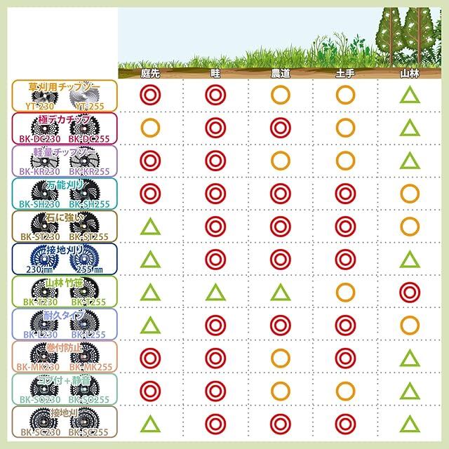 【特徴】石に強いチップソーです。鉄鋼用チップソーの埋め込み刃型に特殊研磨で切れ味もバツグン!本体中心にまっすぐに深く埋め込まれたチップは、ロー付け面積が広いためチップが飛びにくい設計で、驚異的なチップ耐久性を実現しました。タイルや石を切るチップソーの刃形を参考に屈強刃チップを実現しました。殆どのメーカーのエンジン刈払機にも取付られます。