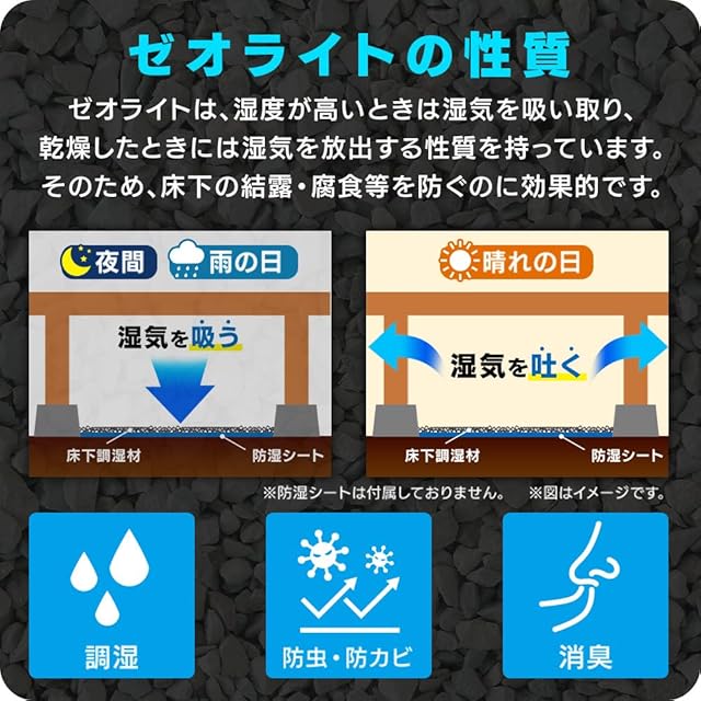 [ゼオライトとは:湿度が高いときは湿気を吸い取り、乾燥したときには湿気を放出する機能を持っています。床下の結露、腐食等に効果的です。]