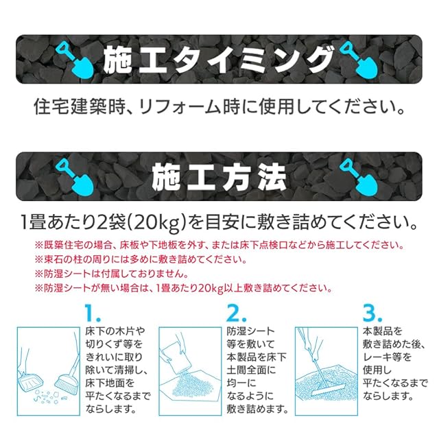【施工方法】1.床下の木片や切りくず等をきれいに取り除いて清掃し、床下地面を平たくなるまでならします。/2.防湿シート等を敷いて、本製品を床下土間全面に均一になるように敷き詰めます。/3.本製品を敷き詰めた後、レーキ等を使用し平たくなるまでならします。