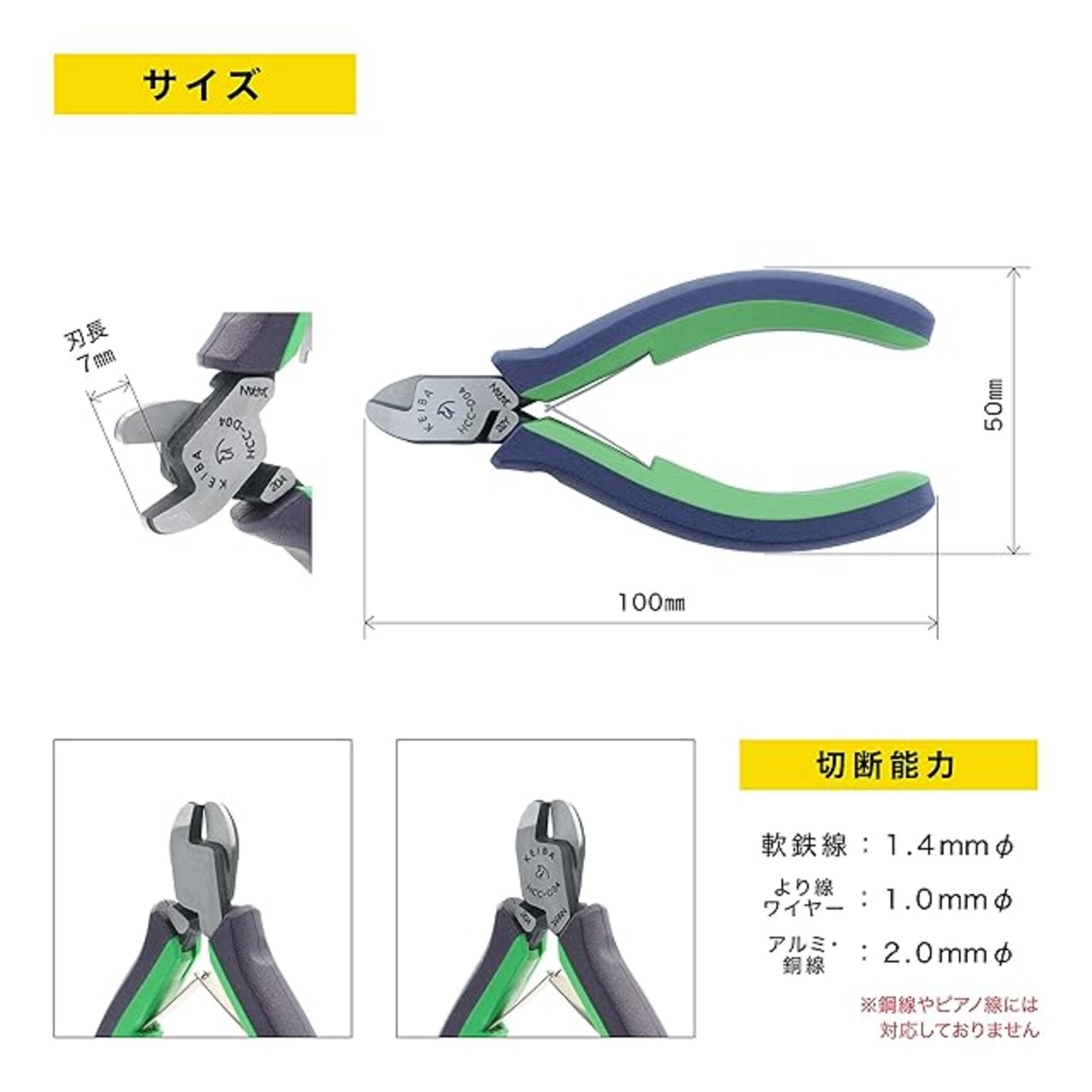 切断能力:(軟鉄線)1.4mm径・(より線ワイヤー)1.0mm径・(アルミ・銅線)2.0mm径