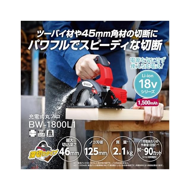 商品名:京セラ(Kyocera) 旧リョービ 充電式丸ノコ BW-1800L1 600101A 【ツーバイ材や45mm角材の切断に】パワフルでスピーディーな切断 電源を気にせず使える充電式 小型・軽量 ノコ刃外径125mm 最大切込深さ46mmの深切りタイプ 45°までの傾斜切断可能 バランスが良く握りやすいハンドル リチウムイオン18V