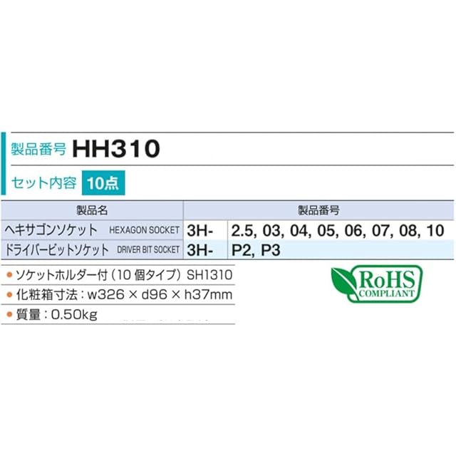 商品名:トネ(TONE) ヘキサゴンソケットセット(ホルダー付) HH310 差込角9.5mm(3/8") 内容10点