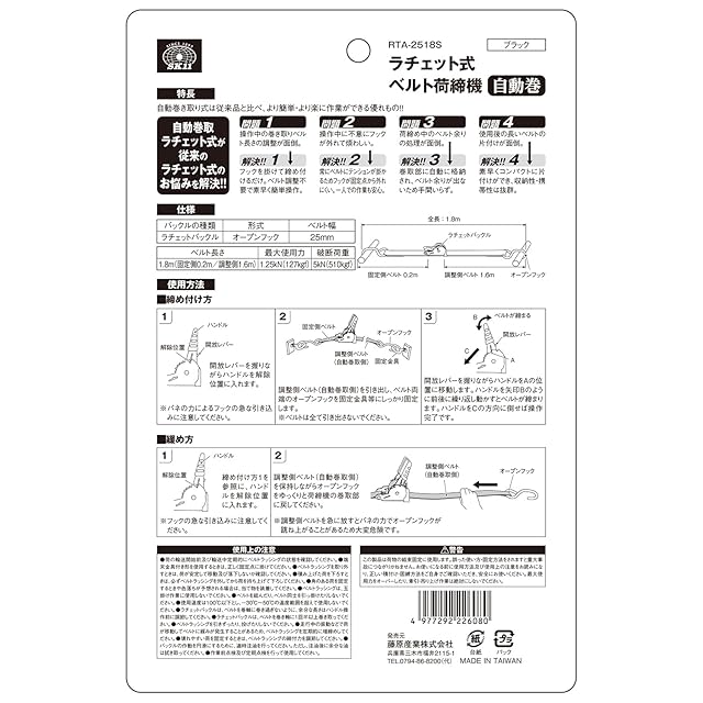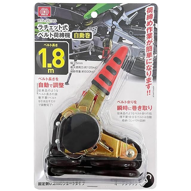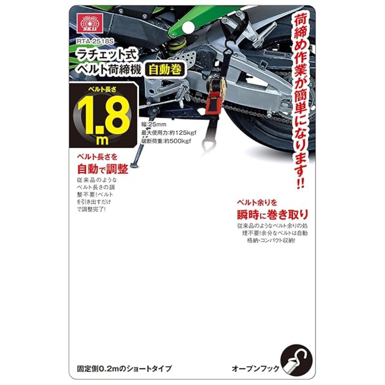 商品名:SK11(エスケー11) ラチェット式ベルト荷締機 自動巻 ベルト幅25mm×1.8m オープンフック RTA-2518S