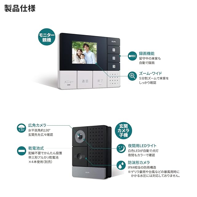 商品名:エルパ(ELPA) テレビドアホン DECTワイヤレスインターホン 配線工事不要 自動録画 親機1台カメラ子機1台セット DHS-SM2030