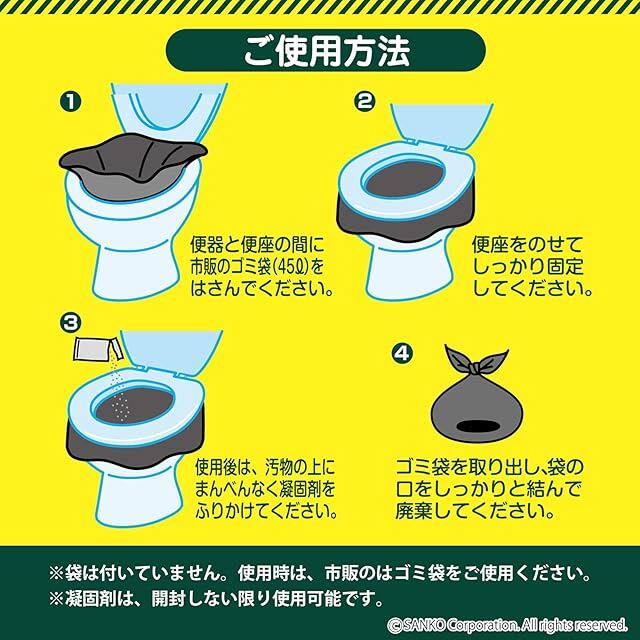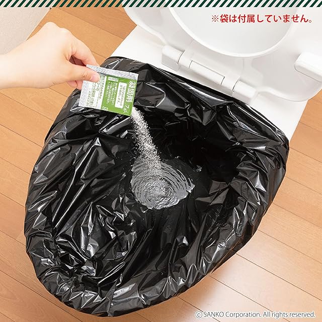 注意:凝固剤は便器の中に入れないでください。つまる原因になります。ゴミ袋は付属していません。