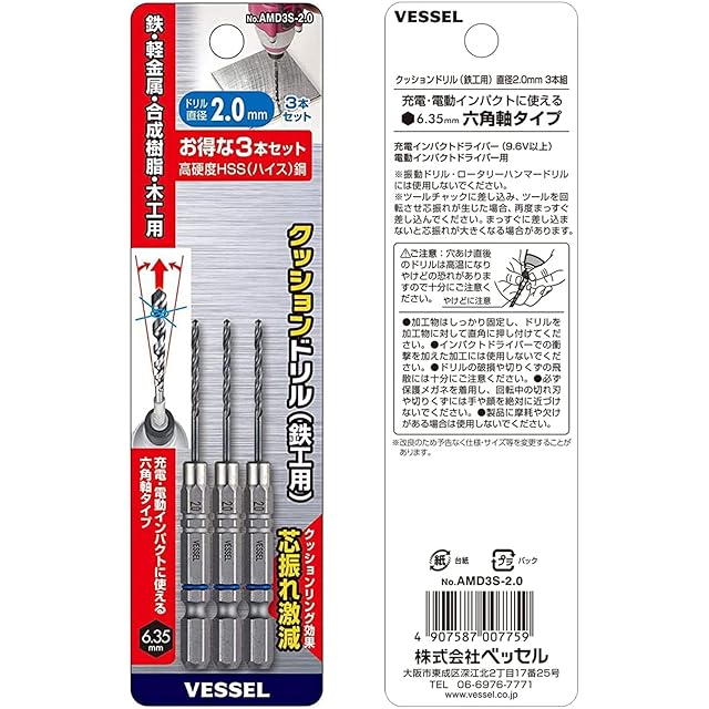 商品名:ベッセル(VESSEL) クッションドリル <鉄工用> ドリルビットセット Φ2.0mm 3本組 AMD3S-2.0