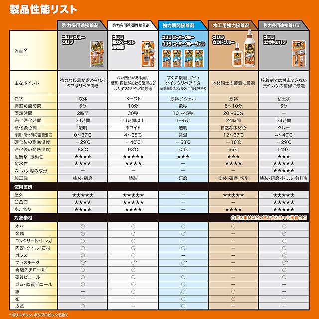 多用途・超強力接着、凹凸素材も強力接着、耐水性にすぐれ屋内・外OK