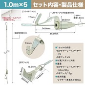 【商品詳細】ワイヤー&フック 5本~20本セット<ワイヤーの太さ>直径1.5mm<スライドフック>全長65.9mm 高さ20.3mm<S字固定器具>全長54.6mm 横幅29.5mm 重量12g 材質:ステンレス鋼 重量:0.5m/26g1.0m/31g1.5m/35g