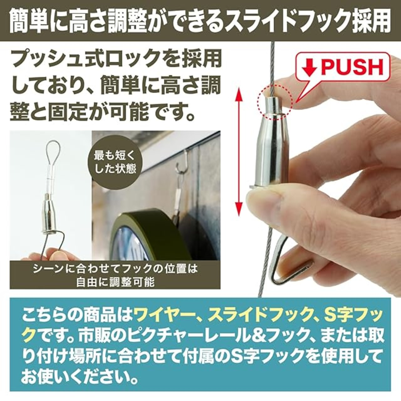 【大切な絵画をしっかり固定】丈夫なステンレスワイヤーで安心・安全に額やポスターなどを固定することができます。シンプル・スタイリッシュなデザインで使用場所を選びません。※当商品にピクチャーレール&ピクチャーレールに装着する専用フックは付属しておりません。別途市販品をお買い求めください。 【あらゆる場所で使えるすっきりデザイン】小さな絵は1点吊りで、大きな絵は2点吊りでご使用ください。ワイヤーには壁面フックやレールフックなどにひっかけてください。付属のS字固定具は長押などにひっかけ、ワイヤーをひっかけて頂くことが可能です。 ※市販のピクチャーレールなどにS字フックを直接ひっかけるのはやめてください。脱落の恐れがあります。 【簡単に高さ調節ができるスライドフック採用】プッシュ式ロックを採用しており、簡単に高さ調節が可能です。 取り付け部分の筒を押し上げることで簡単に移動できます。片手で調整できるため女性や初心者の方でもストレスなく快適にご使用いただけます。 【大切なものを吊るすから品質はこだわりたい】ワイヤー(0.5m)1本あたりの最大吊り下げ重量は20kg※(耐荷重試験/東京都 令和5年12月実施 引張試験結果68.9kgf)カシメ部(ループ上側)はダブルで信頼性を確保。端部(下)側はロングスリーブにダブルカシメで安全性を確保しています。 【商品詳細】ワイヤー&フック 5本~20本セット<ワイヤーの太さ>直径1.5mm<スライドフック>全長65.9mm 高さ20.3mm<S字固定器具>全長54.6mm 横幅29.5mm 重量12g 材質:ステンレス鋼 重量:0.5m/26g1.0m/31g1.5m/35g