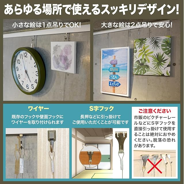 【あらゆる場所で使えるすっきりデザイン】小さな絵は1点吊りで、大きな絵は2点吊りでご使用ください。ワイヤーには壁面フックやレールフックなどにひっかけてください。付属のS字固定具は長押などにひっかけ、ワイヤーをひっかけて頂くことが可能です。 ※市販のピクチャーレールなどにS字フックを直接ひっかけるのはやめてください。脱落の恐れがあります。